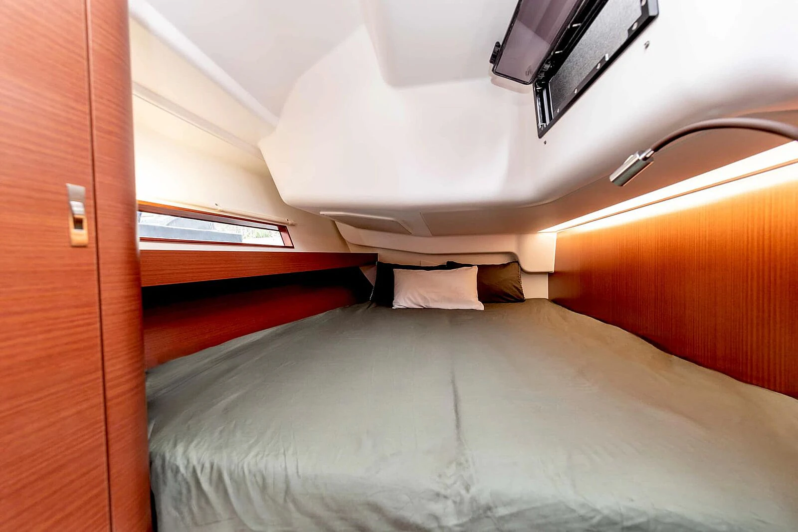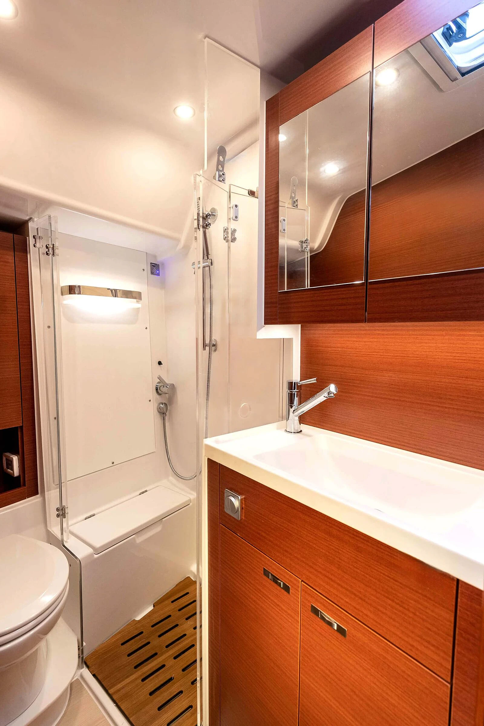 Ambience & details. Tall headroom, a long overhead handrail, generous fiddles, and opening coachroof windows with outward-hinged panes improve ventilation and practicality at sea. Dehler’s Scenario Light System provides dimmable ambient lighting.