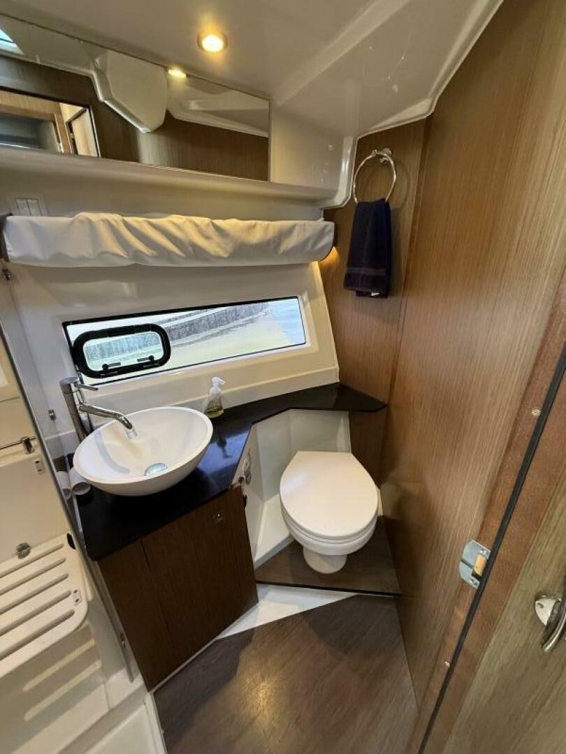 The large head features a modern bowl sink and electric marine toilet. The generous separate shower is unheard of in a vessel this size. With two large windows and an openable porthole there is ample light and fresh air available.