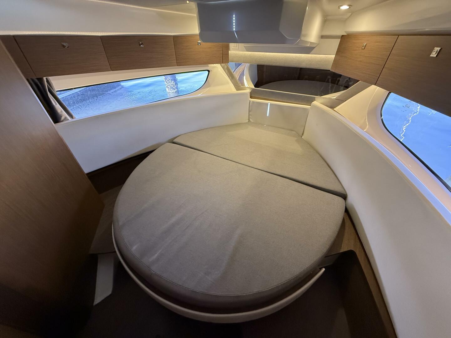 The comfortable helm seat faces a well equipped helm with everything you need at your fingertips. Front and center is your Garmin Nav display with your Fusion stereo display and Yamaha digital engine management system along side. Flanking the adjustable steering wheel are your throttles to starboard and bow thruster, trim controls and switches to port. Starboard sliding door beside the helm to make single handed docking a breeze.