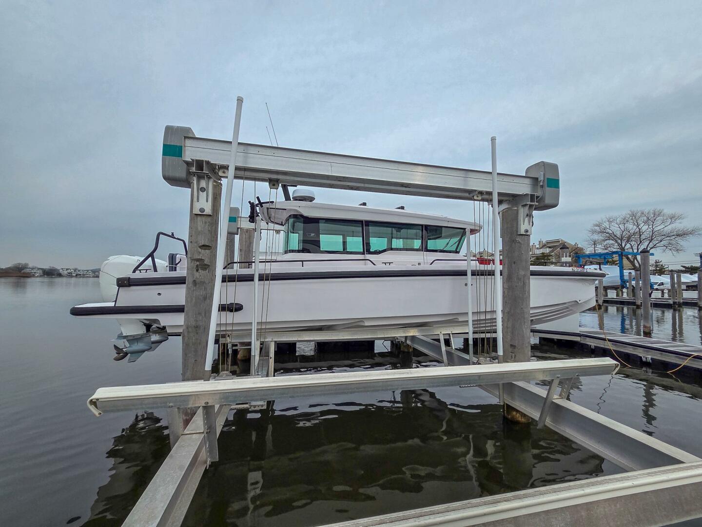 Well-equipped Axopar 37 Cross Cabin with Brabus trim package and 210 hours on her twin Mercury Verado 350hp engines! Clean and well maintained. Cushions and wooden fixtures throughout the boat present as new. Lightly used and always stored out of the water on private lift. Has radar, light bar, and bow & stern thrusters for easy docking