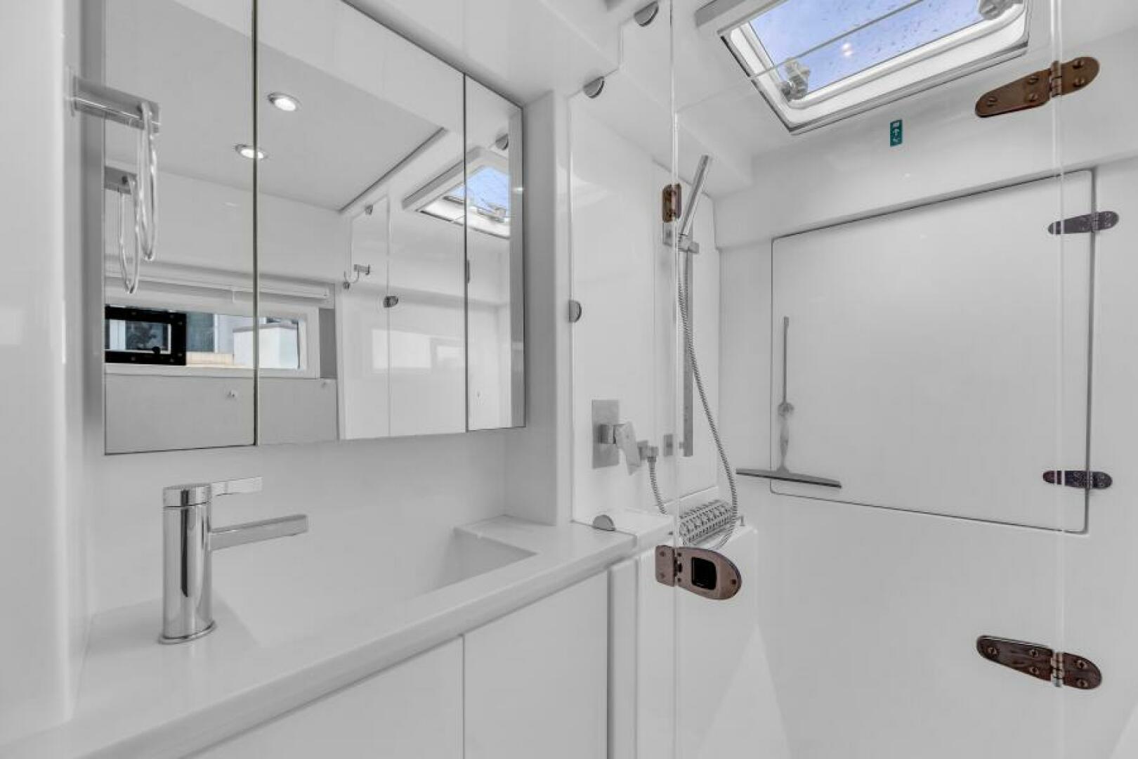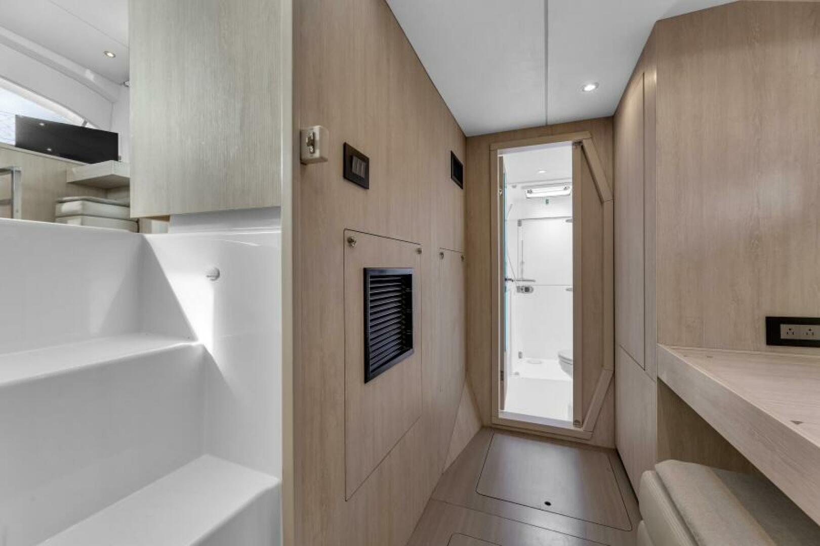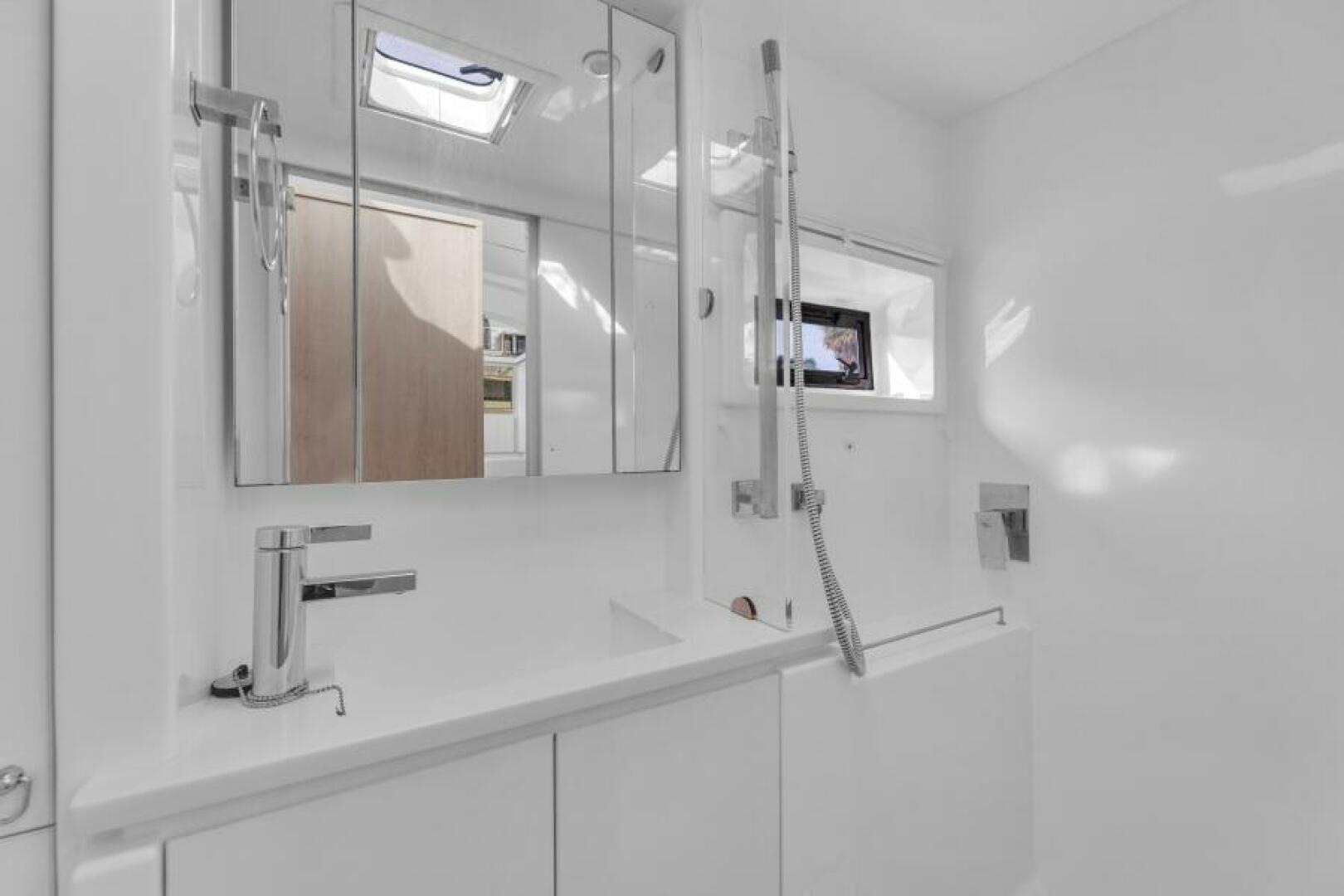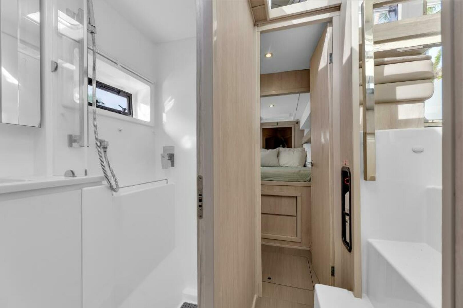 Owner’s Version Layout - Spacious three-cabin layout with a luxurious owner’s suite in the starboard hull, featuring a queen-sized bed, ample storage, and an en-suite bathroom with a separate shower.