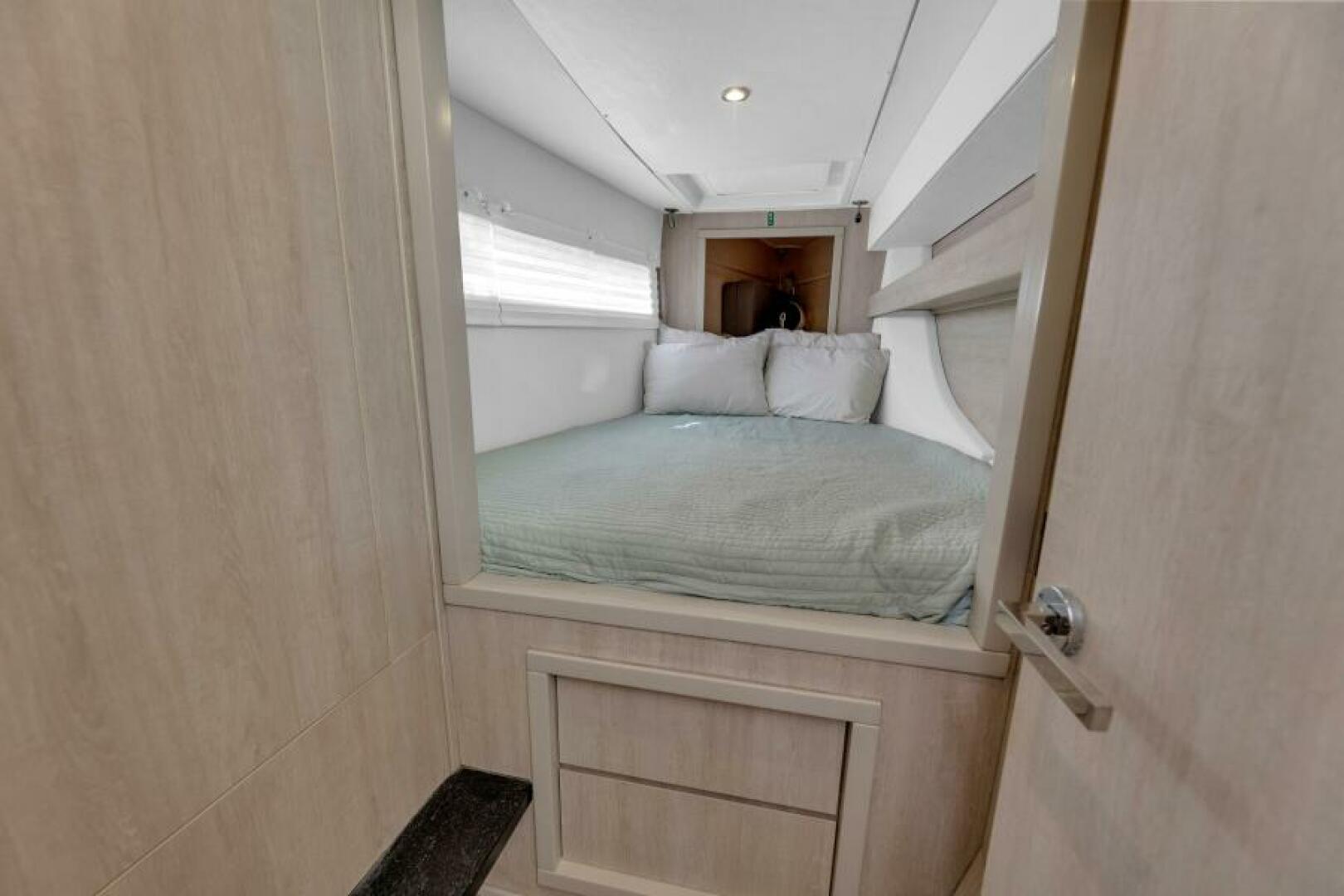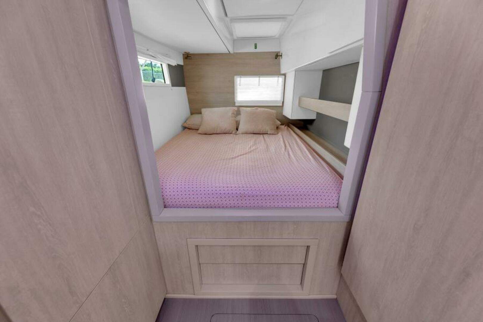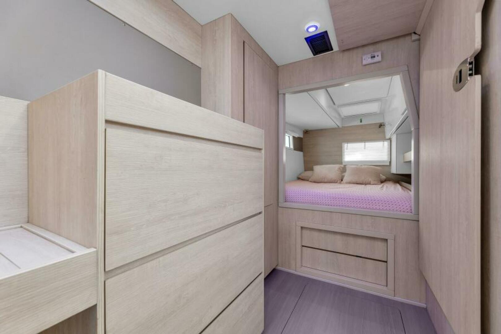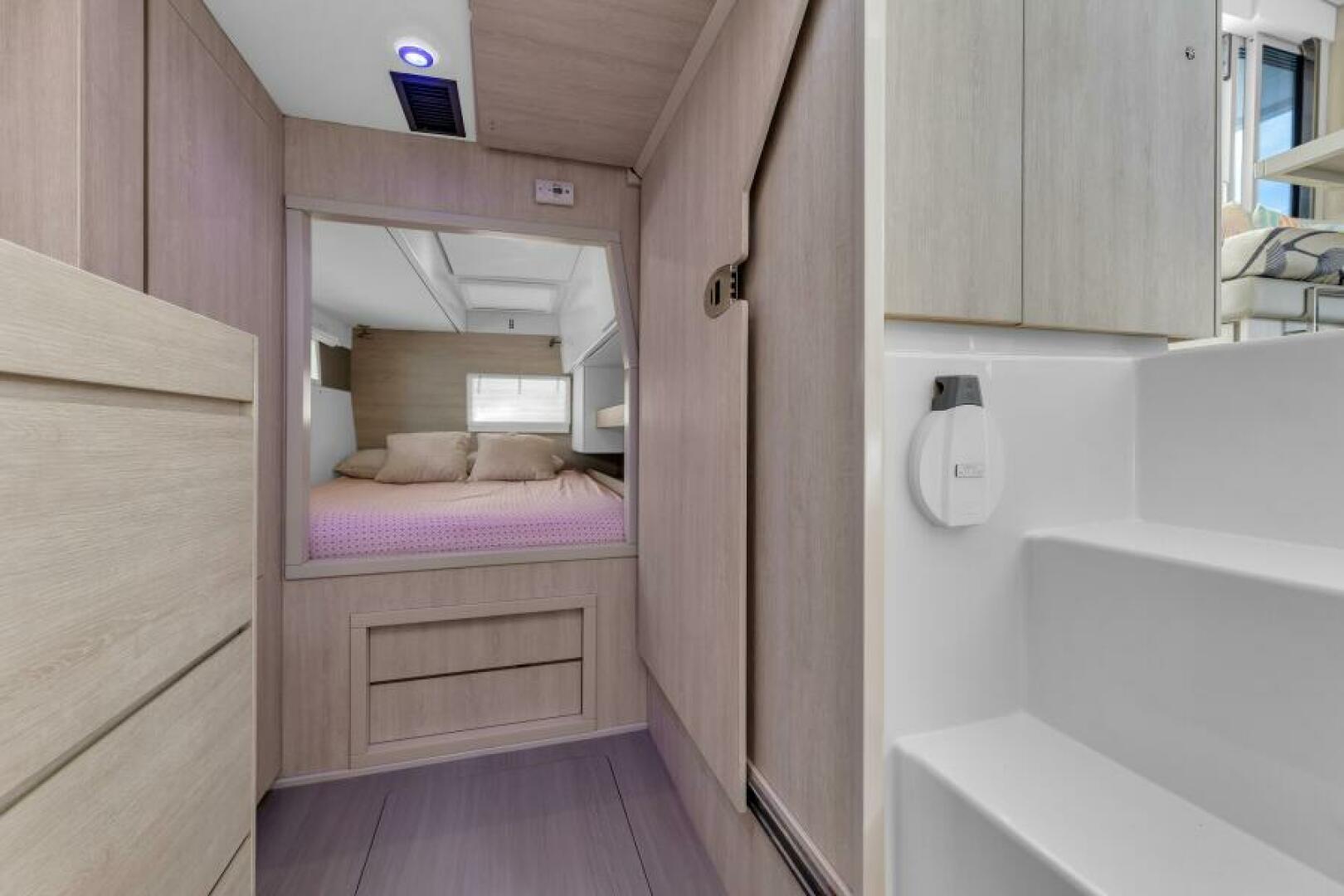Owner’s Version Layout - Spacious three-cabin layout with a luxurious owner’s suite in the starboard hull, featuring a queen-sized bed, ample storage, and an en-suite bathroom with a separate shower.