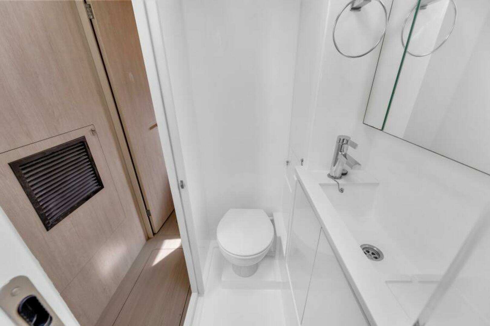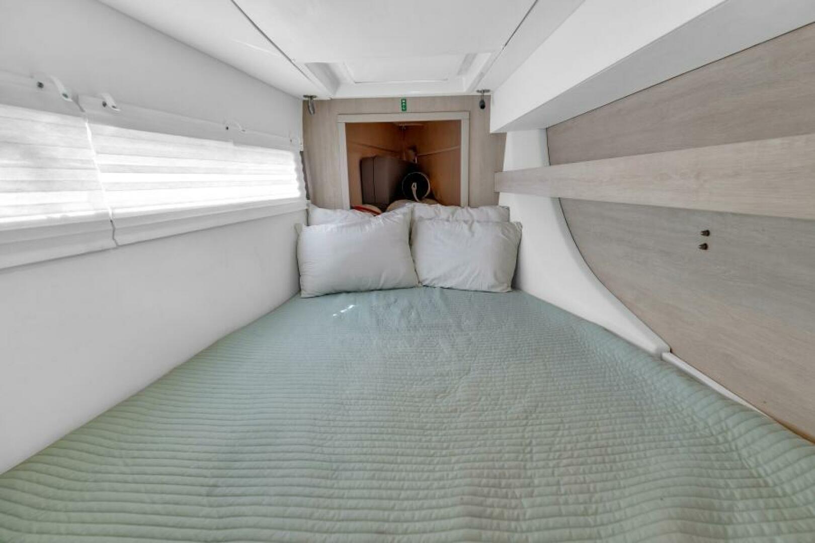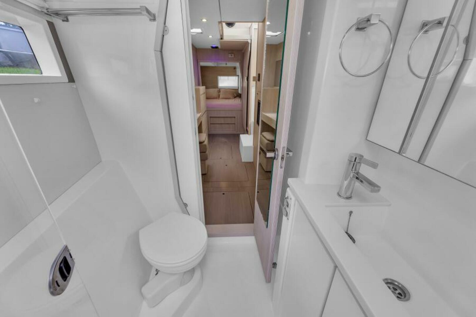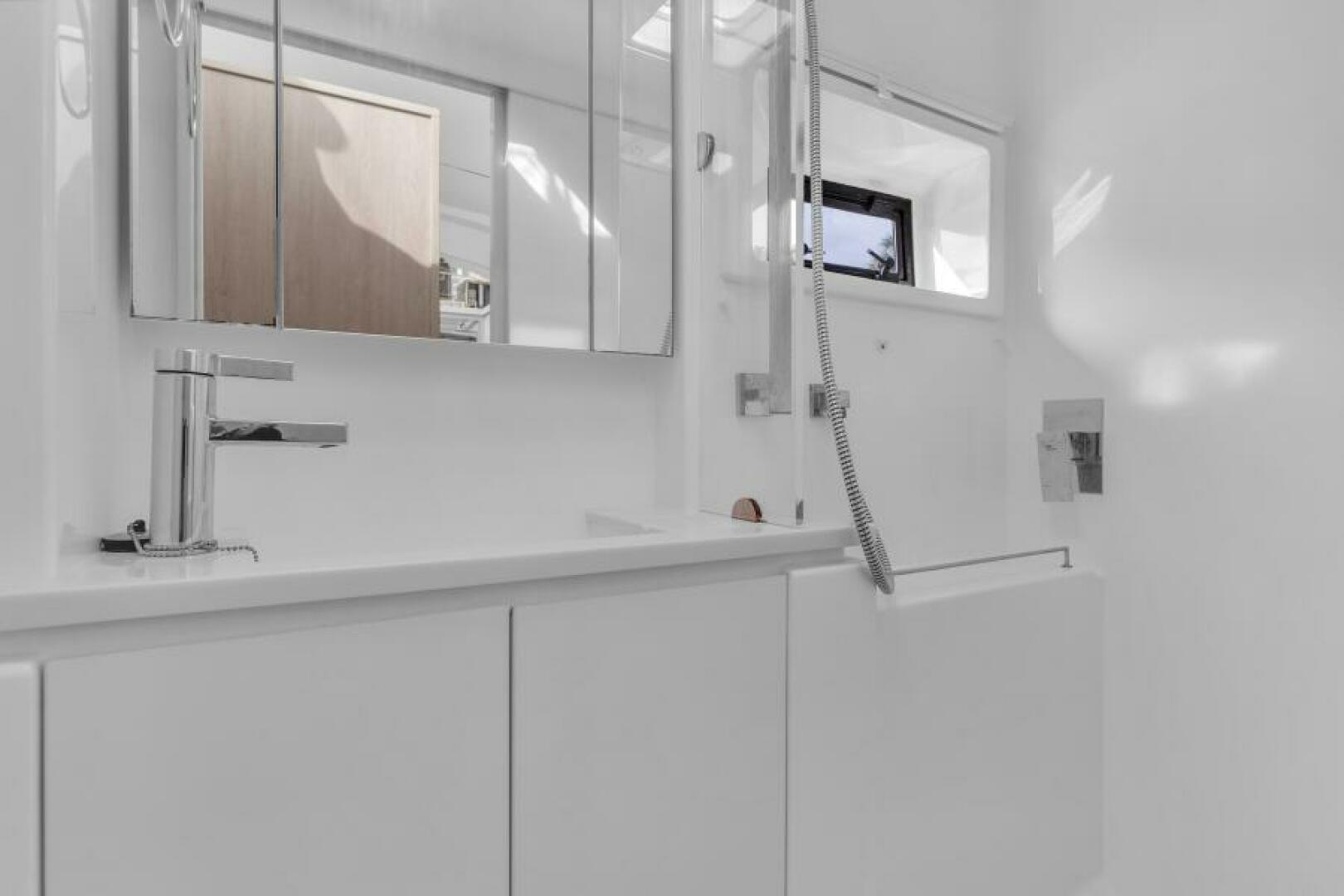 Owner’s Version Layout - Spacious three-cabin layout with a luxurious owner’s suite in the starboard hull, featuring a queen-sized bed, ample storage, and an en-suite bathroom with a separate shower.