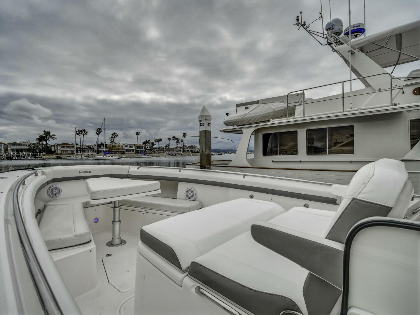 Built using Everglades patented RAMCAP closed-molded construction, which bonds major components with high density foam for a rigid, unsinkable hull and reduced vibration. Variable-deadrise deep-V hull for smooth offshore handling.
