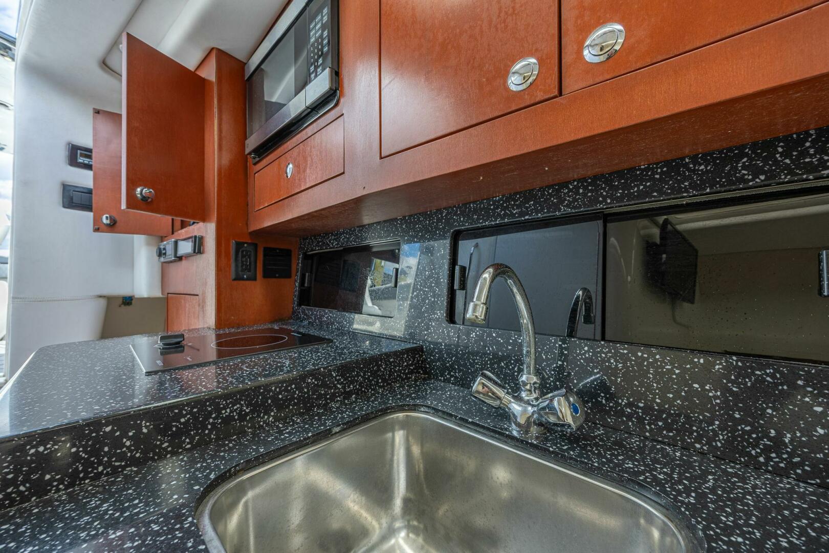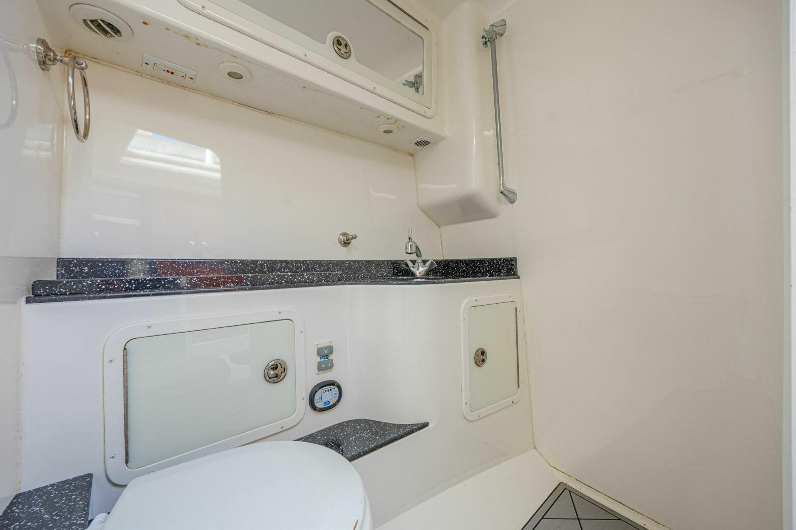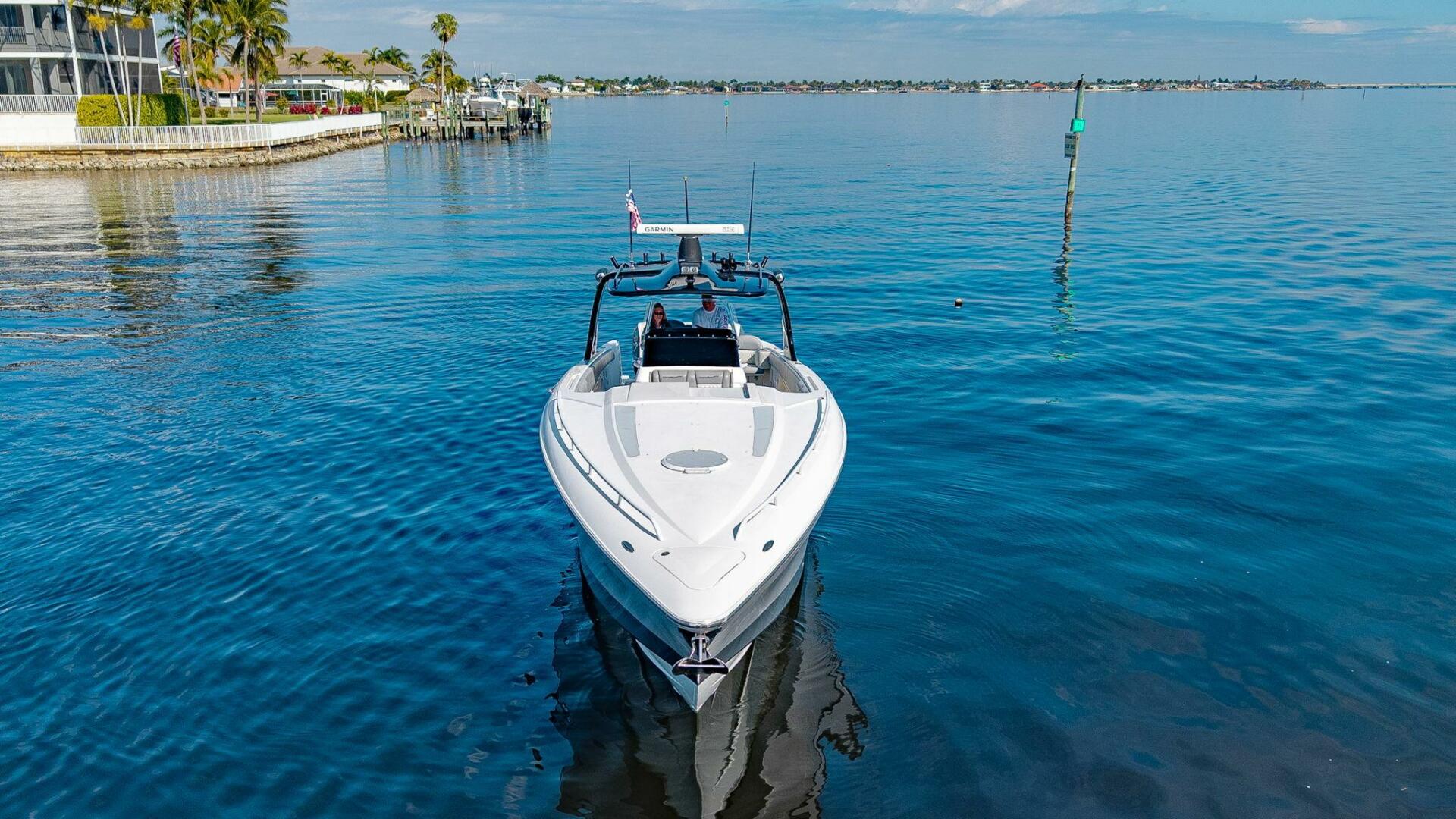 The cockpit is designed for both performance and entertainment, featuring premium upholstery, expansive seating, and a driver-focused helm. Below the deck, the cabin offers comfortable overnight accommodations including a V-berth, enclosed head, and refined finishes—ideal for weekend trips or extended stays.