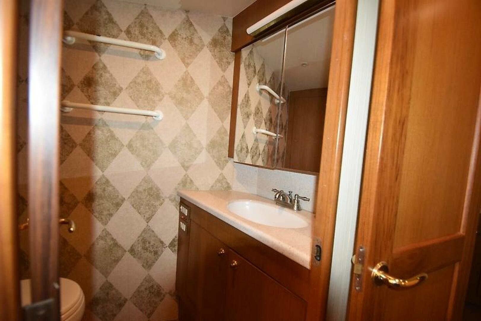 - MASTER HEAD AND SHOWER: Teak and Holly Amtico flooring, Vanity cabinet with teak doors (storage beneath), mirrored medicine cabinet, Corian counter with undermount sink. Vac-U-Flush toilet, Stand-Up shower with bi-fold shower door, fiberglass shower stall with wand, shelf and light.
