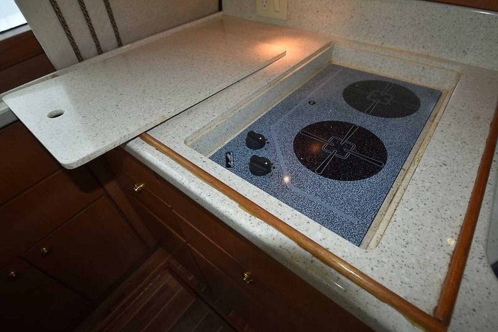 - Port side galley is forward, with Teak and Holly Amtico flooring, Solid Surface countertops and Teak Cabinetry