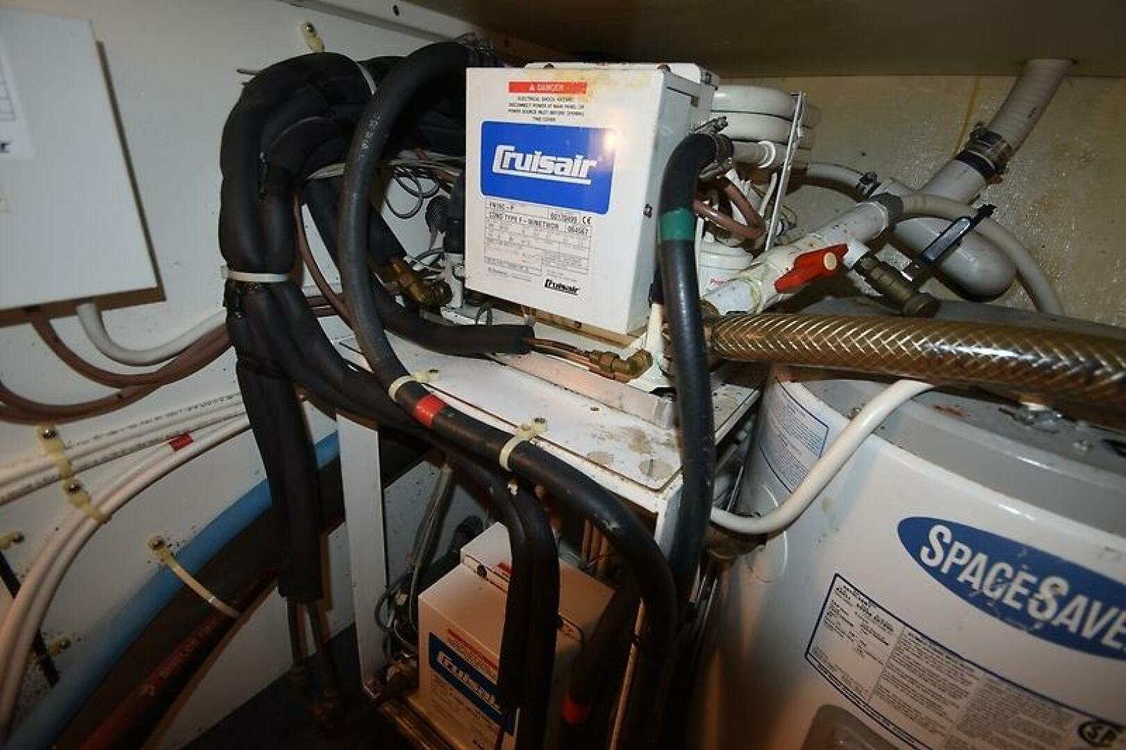 - Bonus Storage Space located via a large hatch in the Galley Floor (Water Heater, Fresh water manifold, Sentry 12v 60 amp Battery Charger, and 2 HVAC Condensing Units located in here, a 24k btu unit for the Salon, and a 16k btu unit for the Staterooms.)