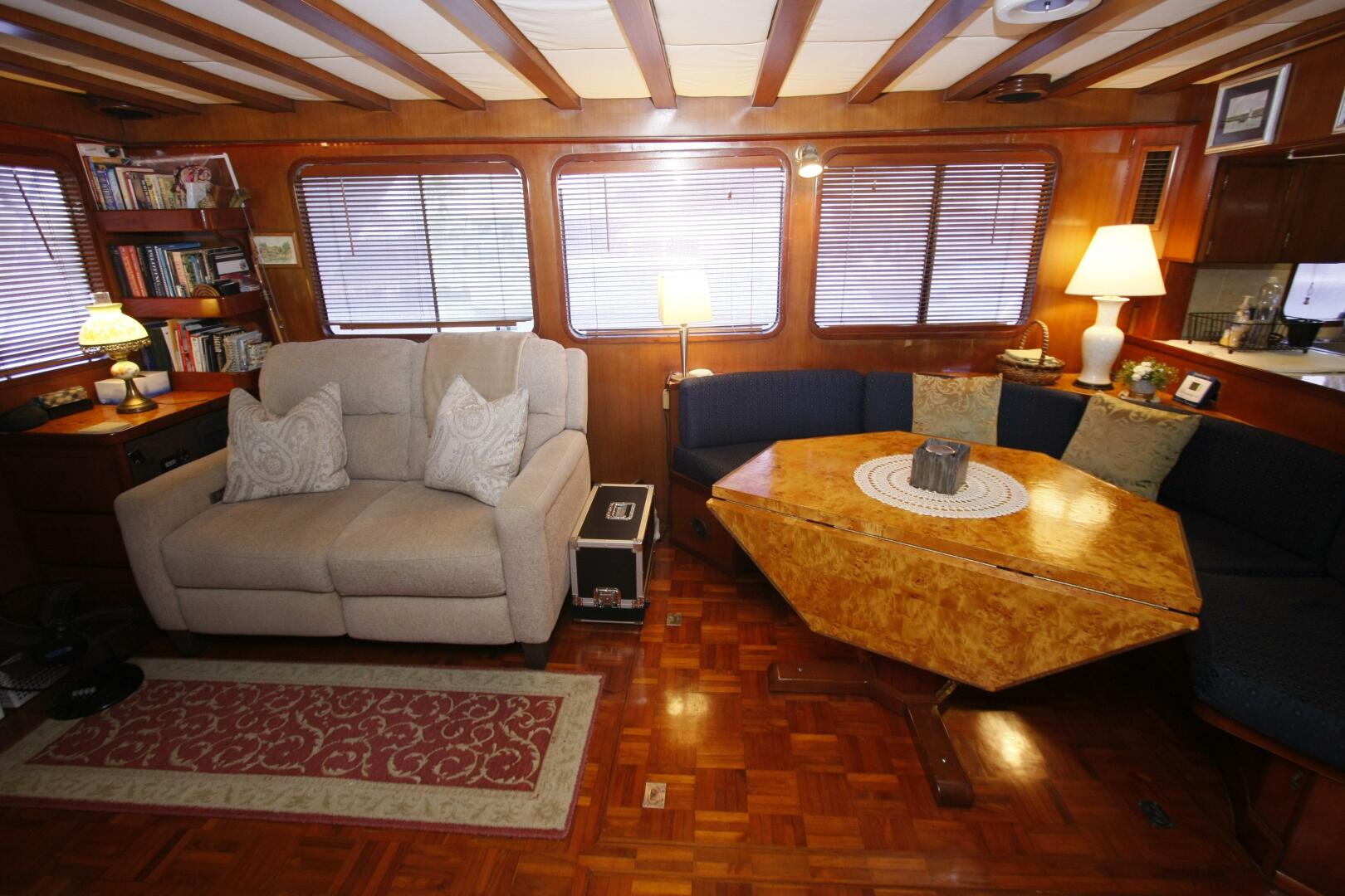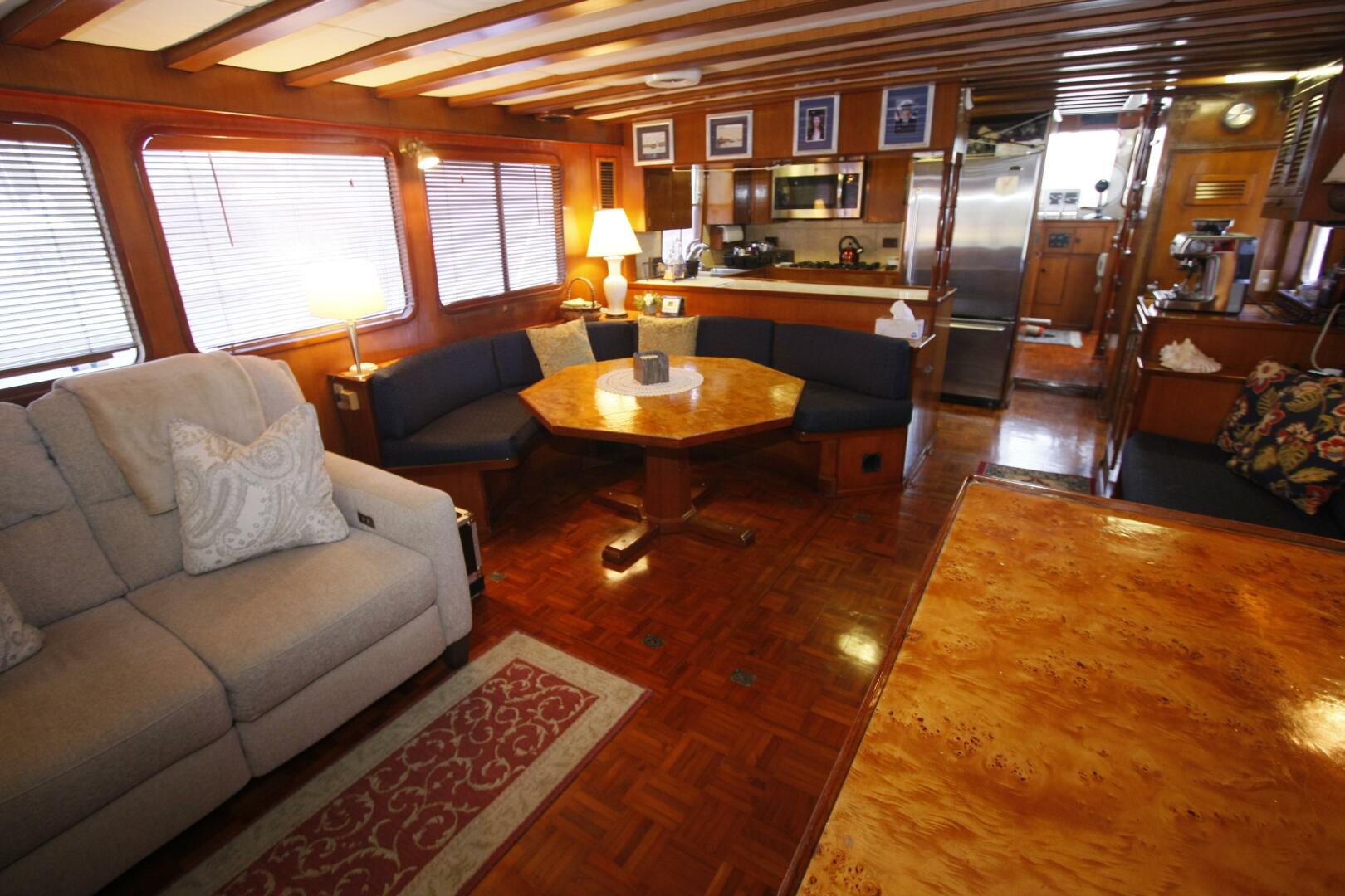 - Deck construction: top deck solid fiberglass; pilothouse/salon/galley are fiberglass with wood interior finish.