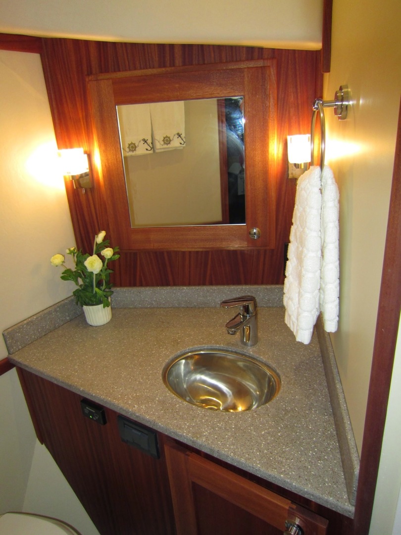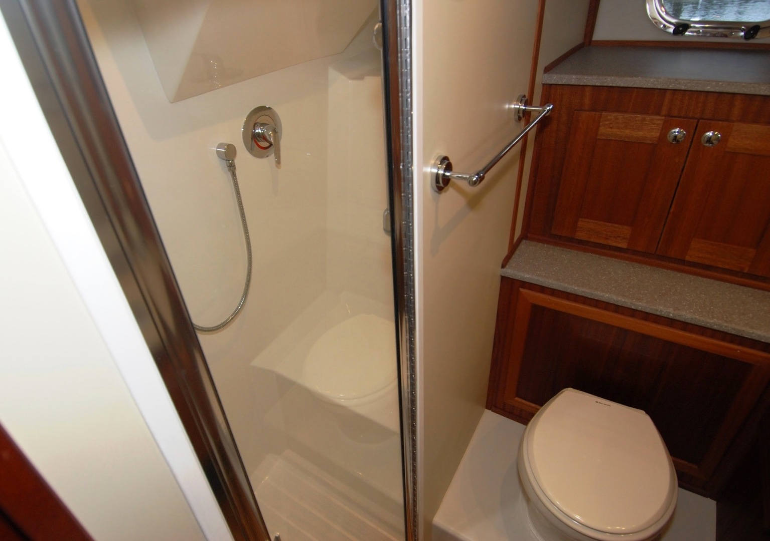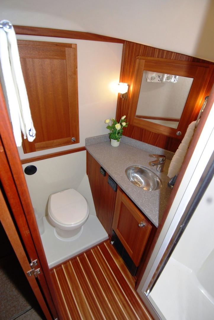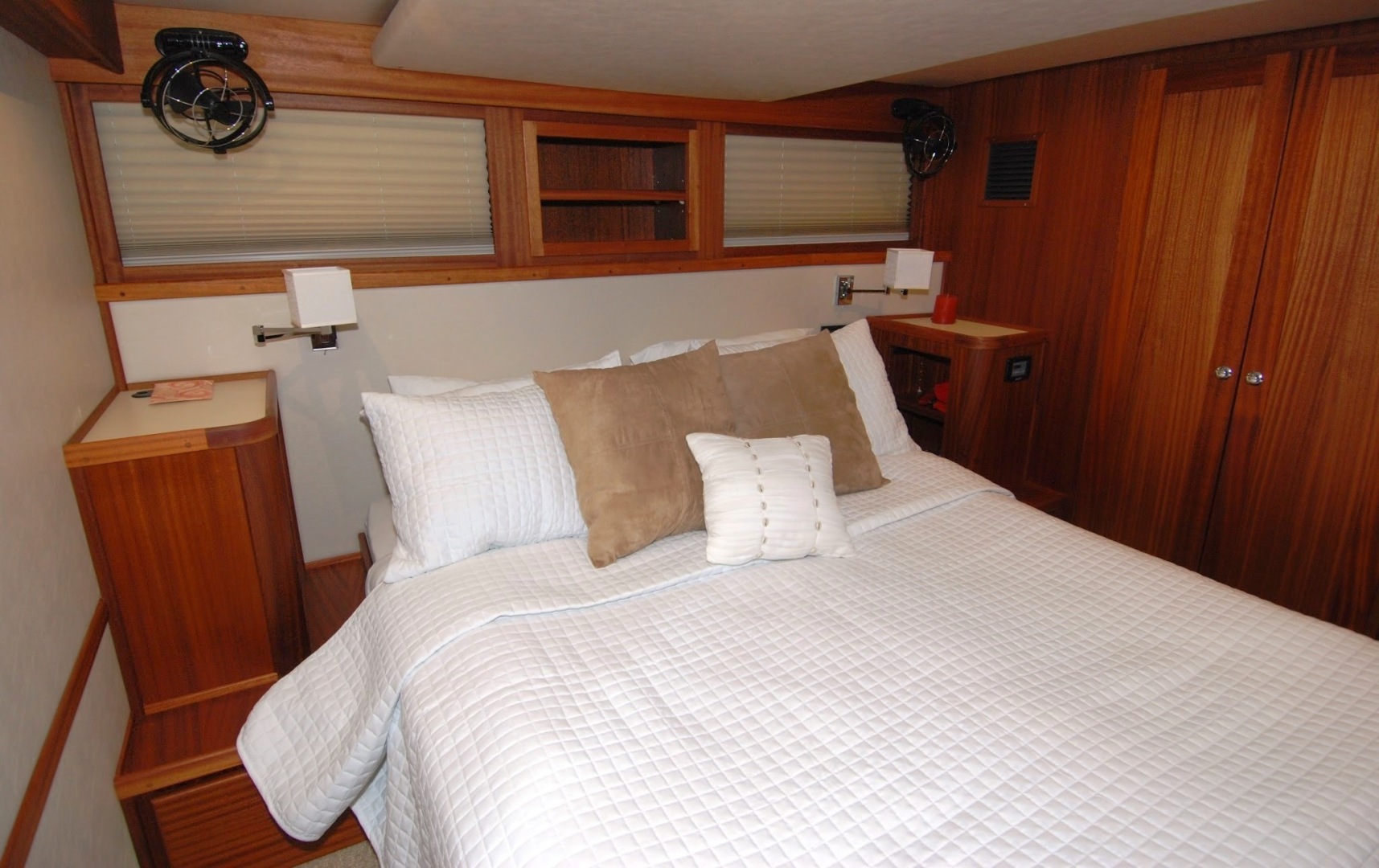 Spacious guest cabin with queen size bed and deluxe head and shower stall to starboard.