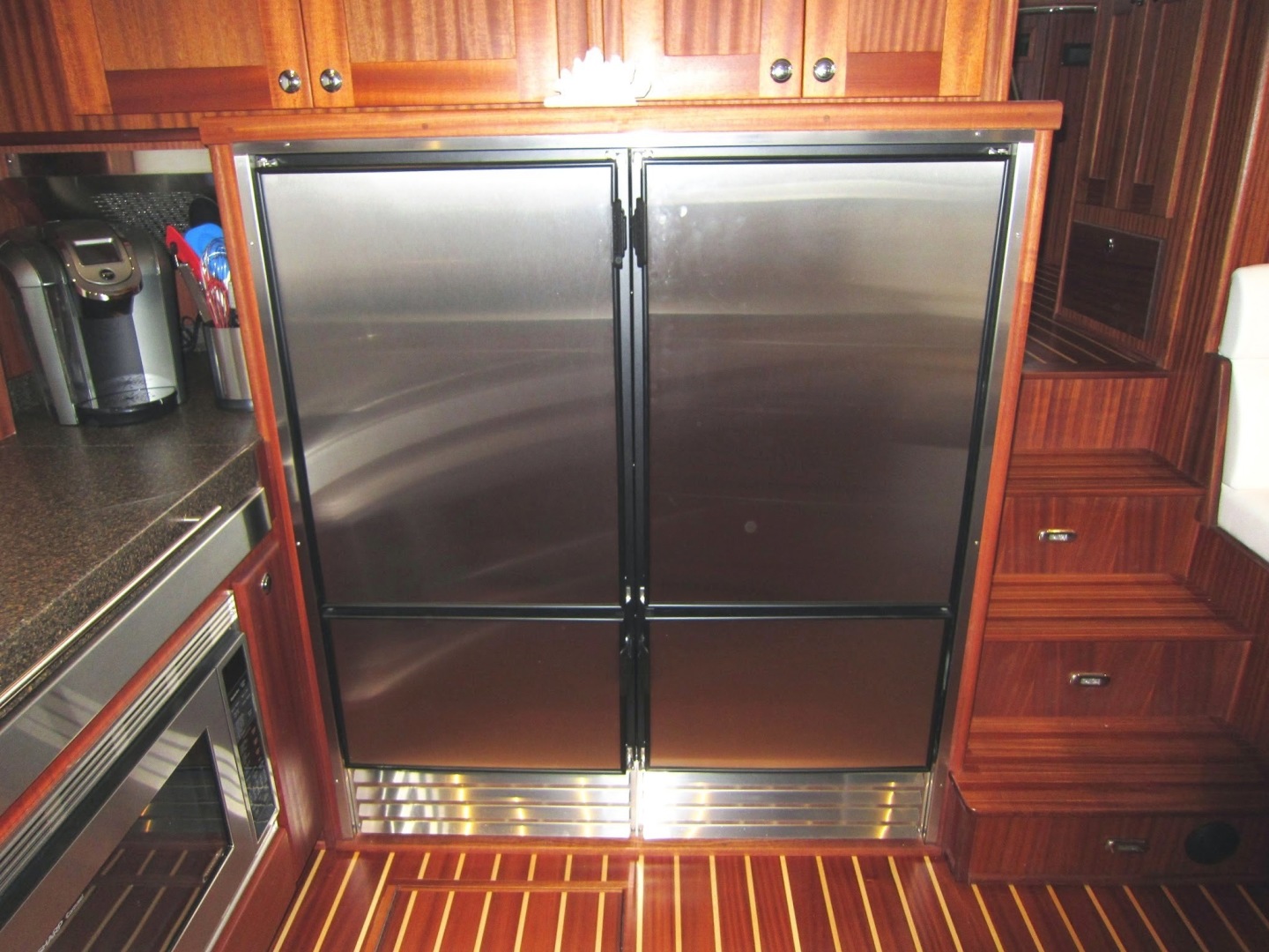 Port side “L” shaped settee and coffee table. Settee converts to an extra guest berth. Two leather recliners to starboard with storage cabinet and large under-counter freezer. 40” flatscreen TV is easily viewed from the all salon seating spaces.