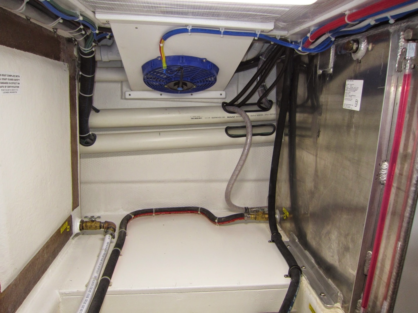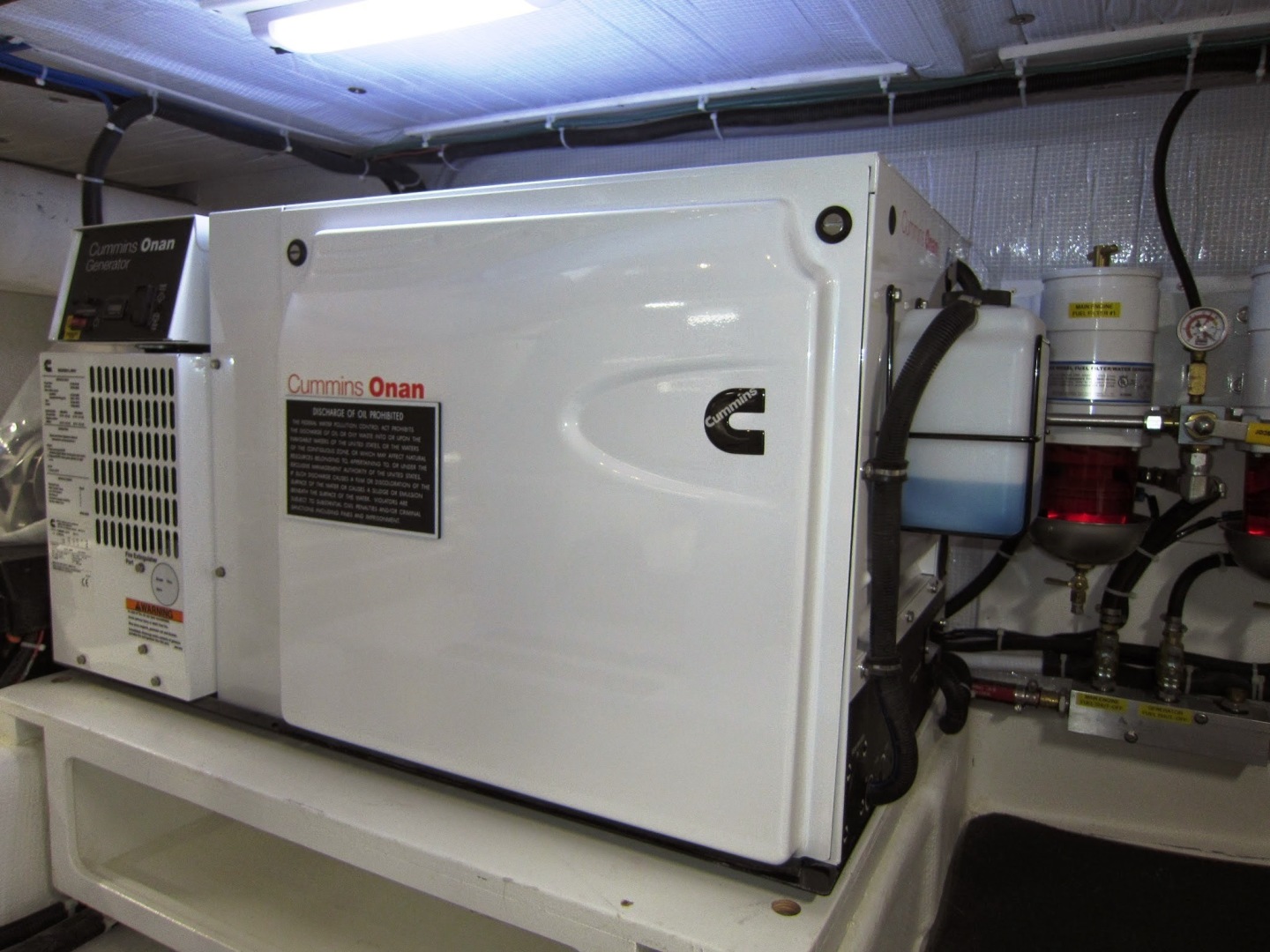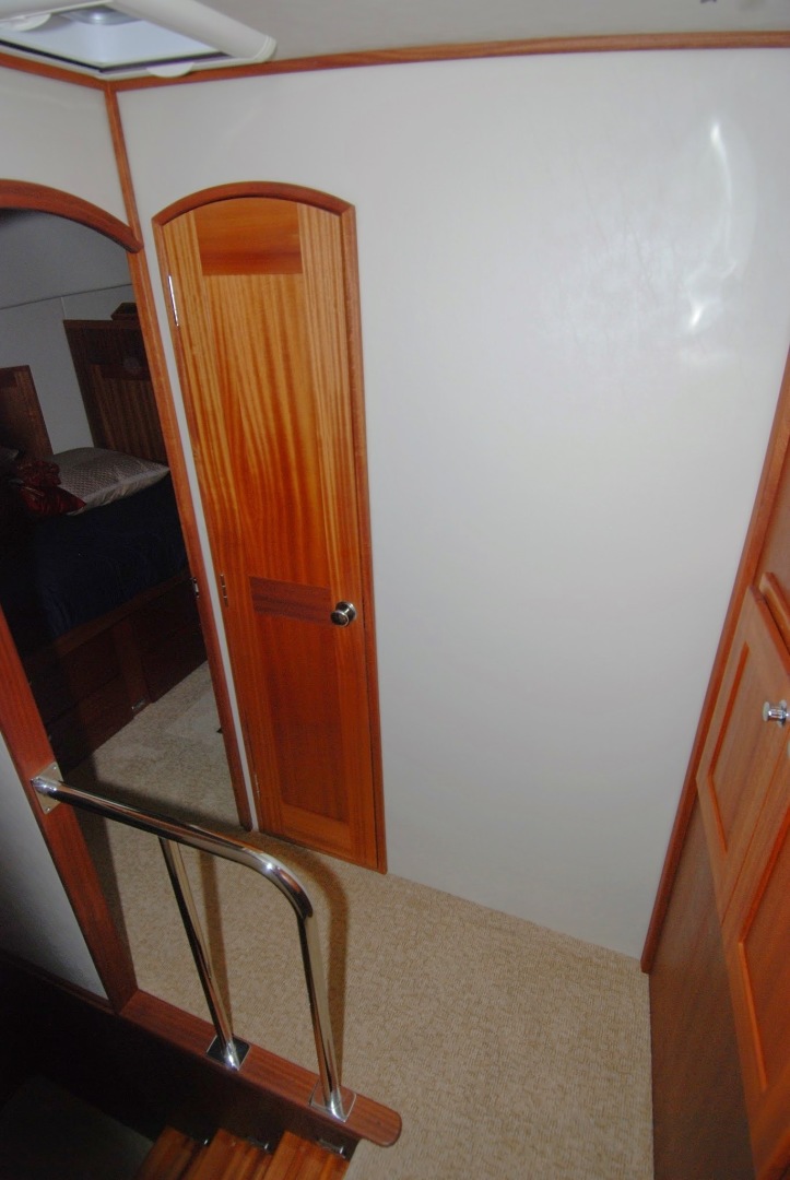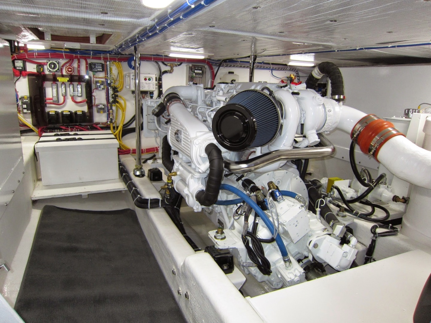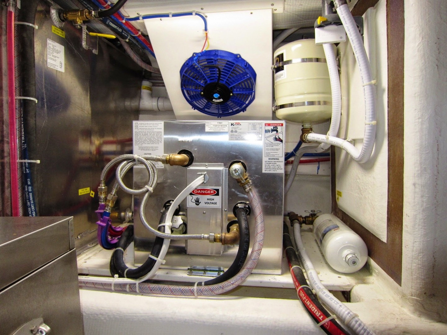 The majority of mechanical systems are all located in the very clean and spacious engine room. Access is easy with two opening hatches in the main cabin. Forward access, in the galley sole, features a wood ladder while aft access, in the center of the salon, offers wood stair steps. The engine room has plenty of room for complete maneuverability making repairs and maintenance easy. Well insulated with heavy duty sound deadening throughout the compartment.