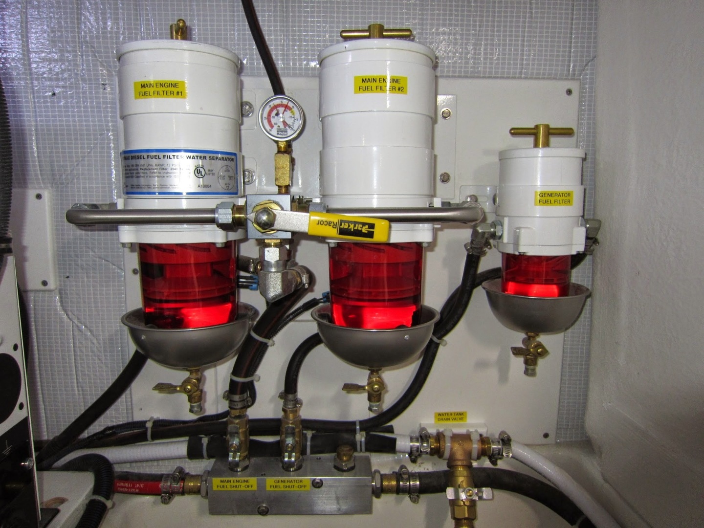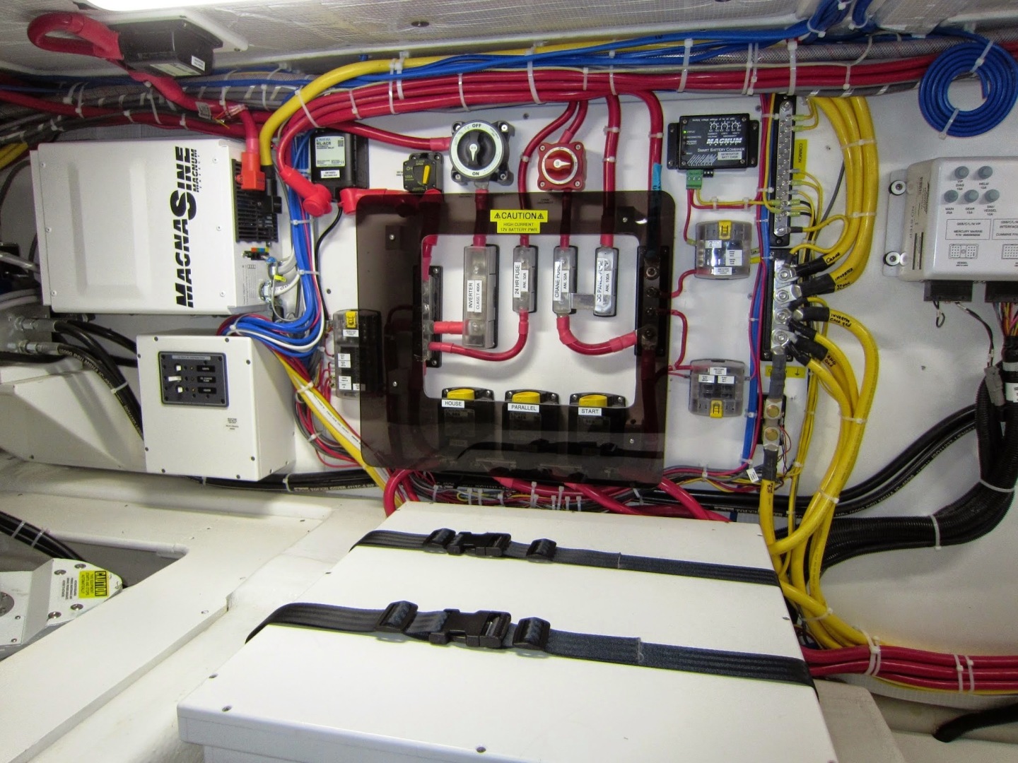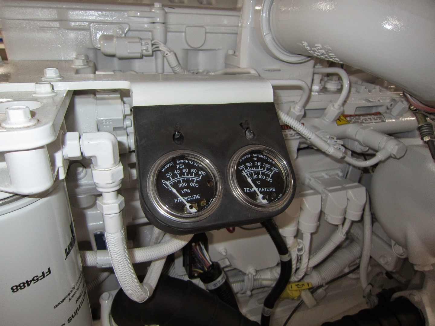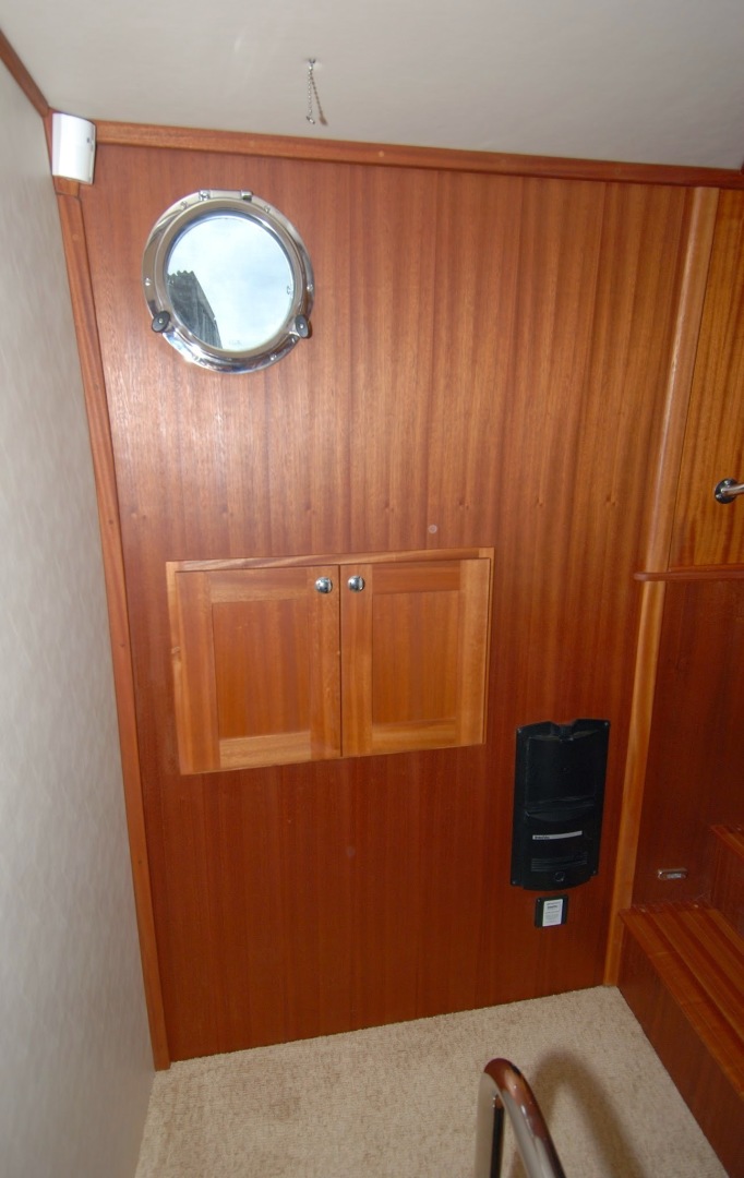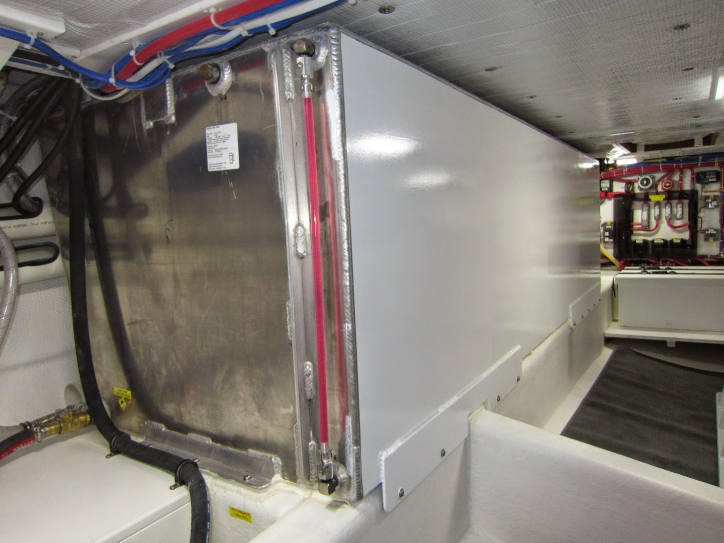 The majority of mechanical systems are all located in the very clean and spacious engine room. Access is easy with two opening hatches in the main cabin. Forward access, in the galley sole, features a wood ladder while aft access, in the center of the salon, offers wood stair steps. The engine room has plenty of room for complete maneuverability making repairs and maintenance easy. Well insulated with heavy duty sound deadening throughout the compartment.