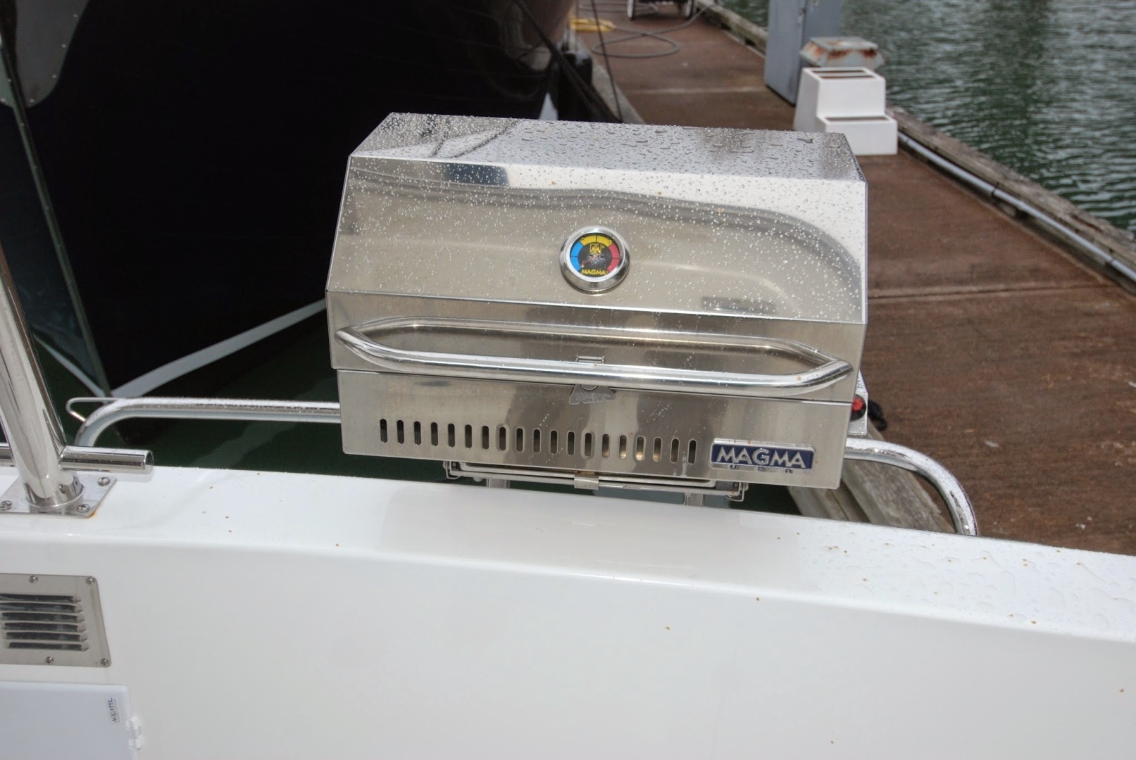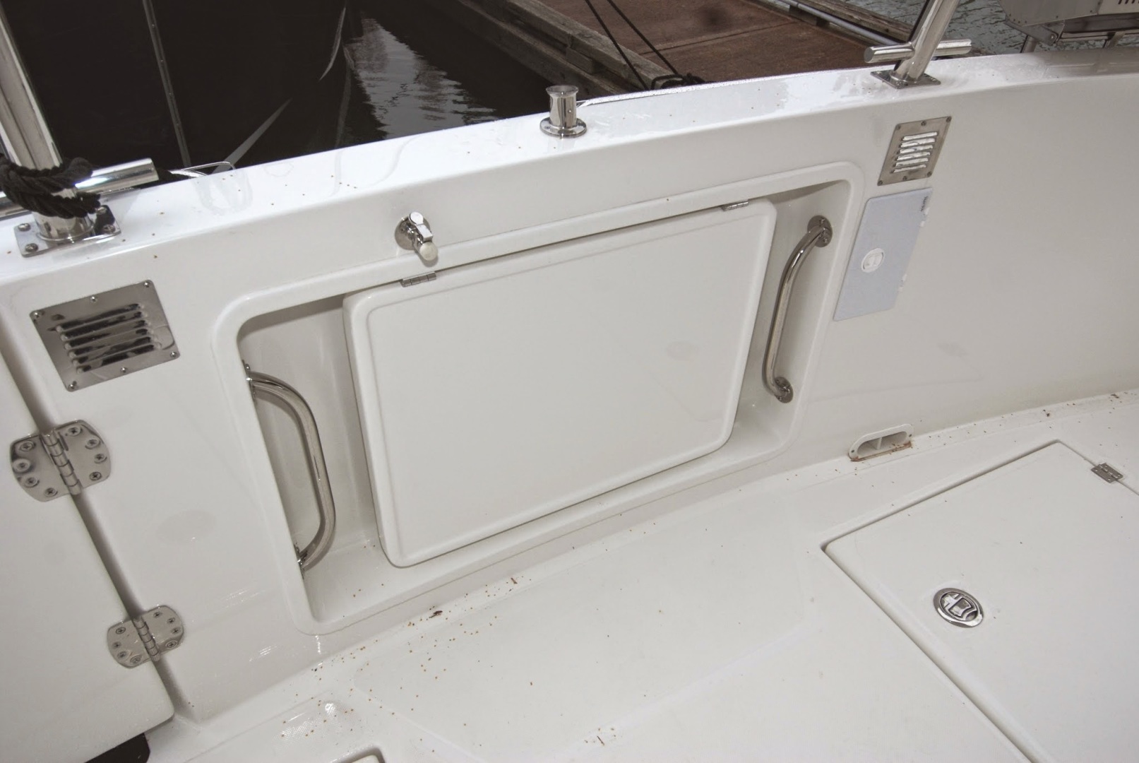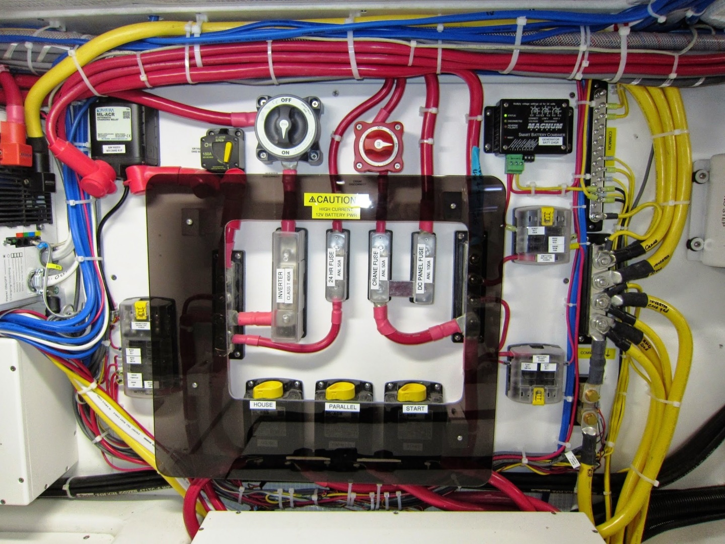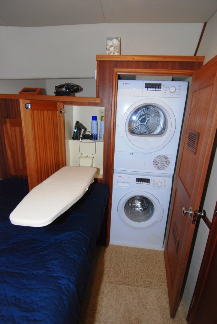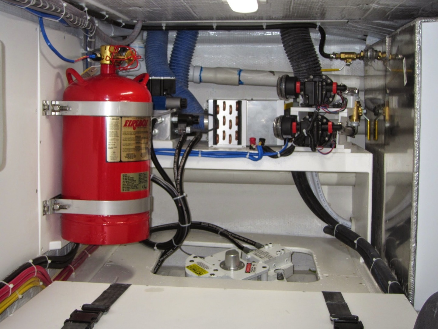 The majority of mechanical systems are all located in the very clean and spacious engine room. Access is easy with two opening hatches in the main cabin. Forward access, in the galley sole, features a wood ladder while aft access, in the center of the salon, offers wood stair steps. The engine room has plenty of room for complete maneuverability making repairs and maintenance easy. Well insulated with heavy duty sound deadening throughout the compartment.