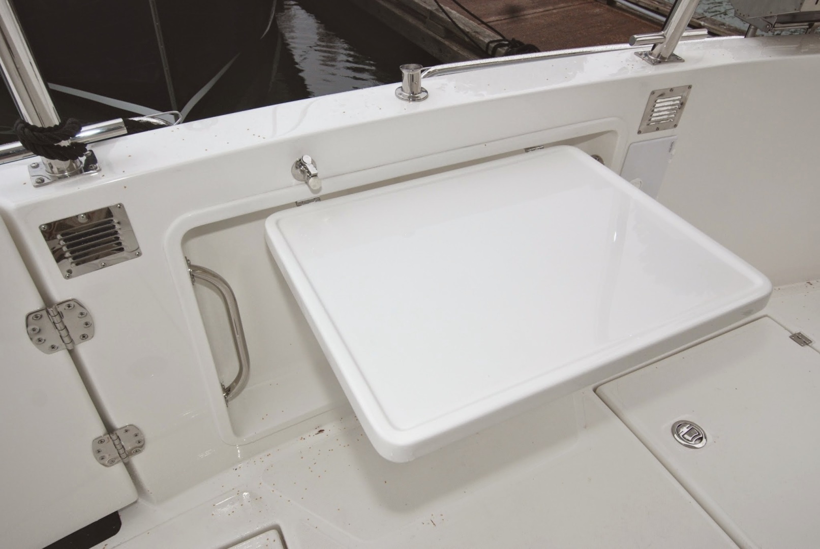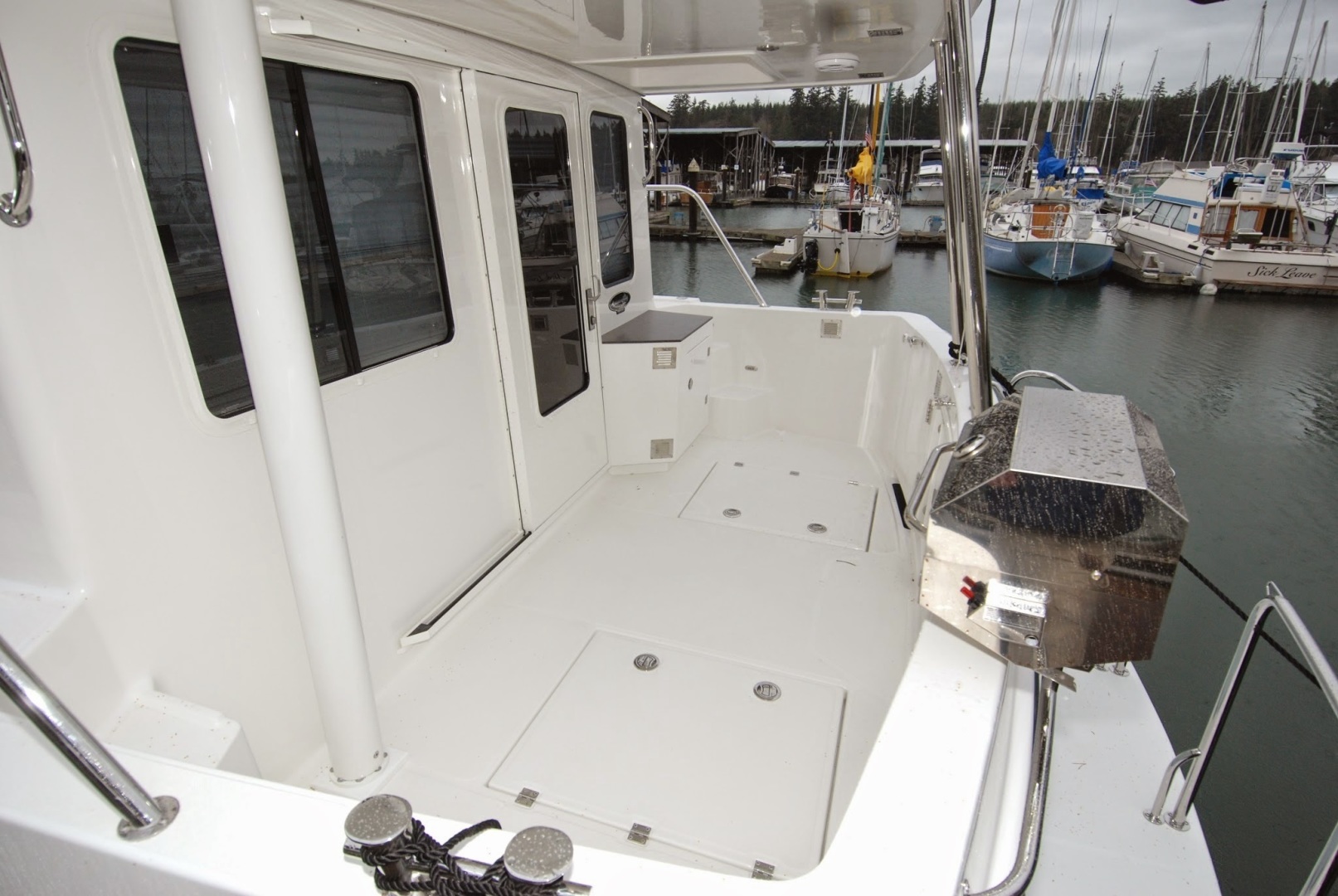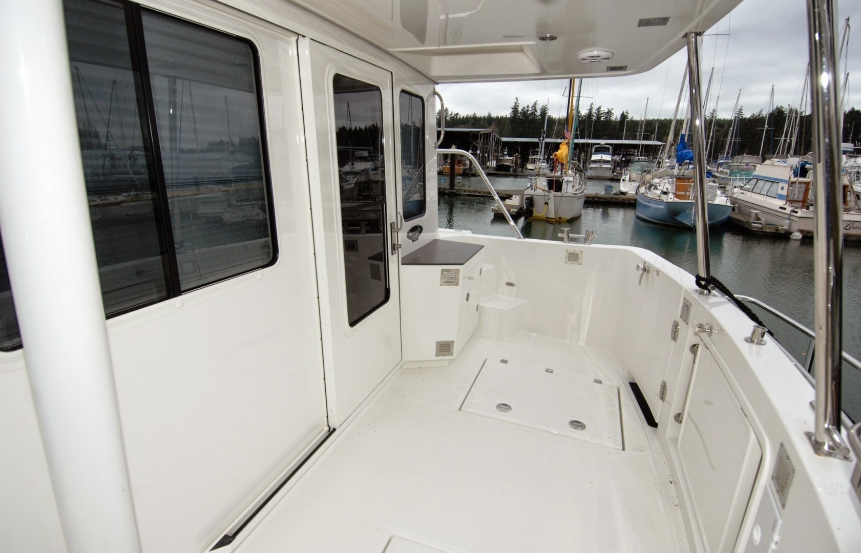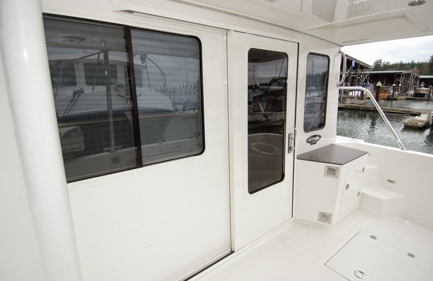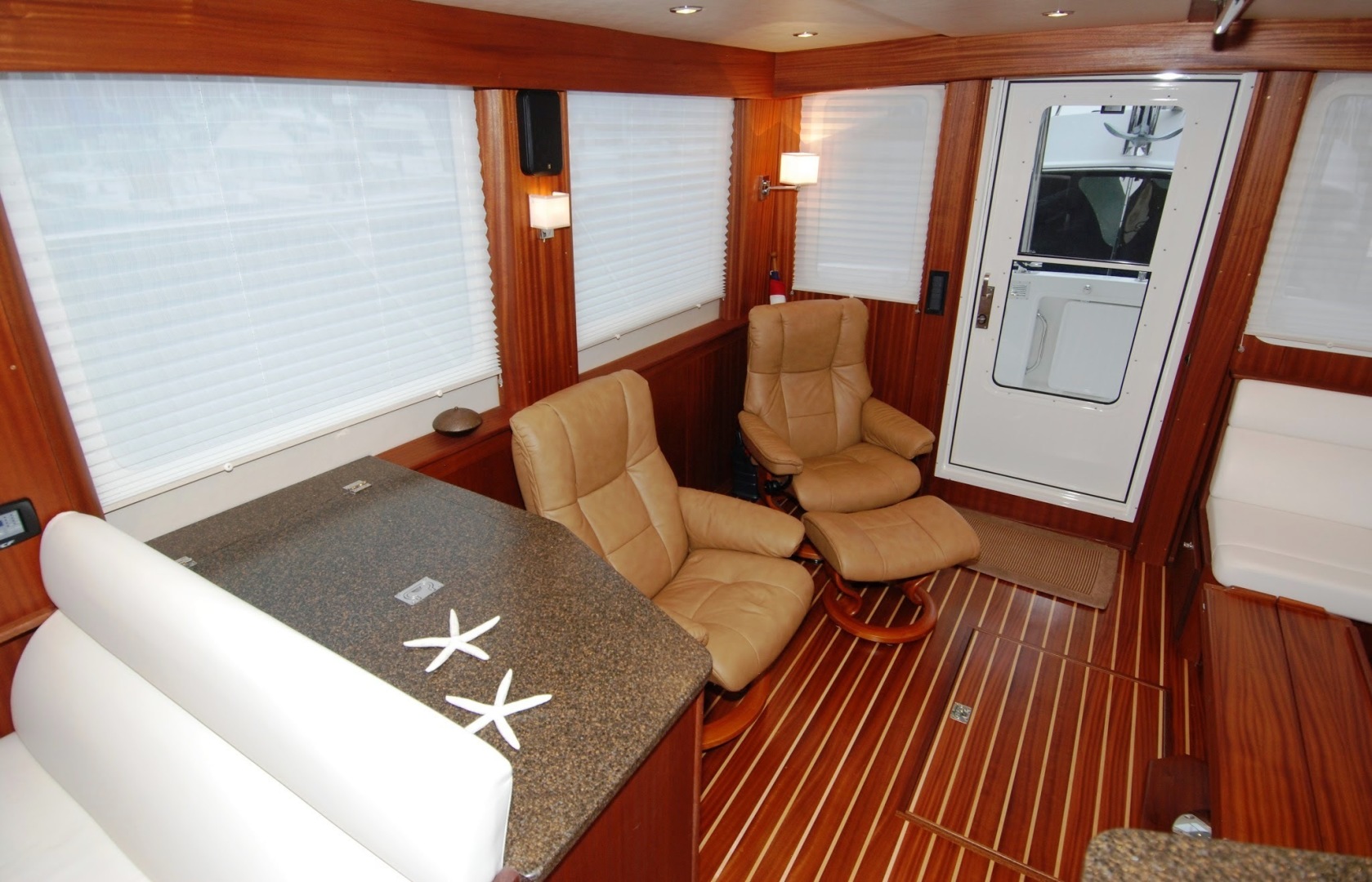 Excellent visibility from this raised pilothouse from the Llebroc helm chair or the comfortable settee. Port and starboard side door make it easy for the helmsman to quickly exit to side decks to handle lines, etc. The wide open steps to the galley and dinette keep conversation easy between the two spaces.