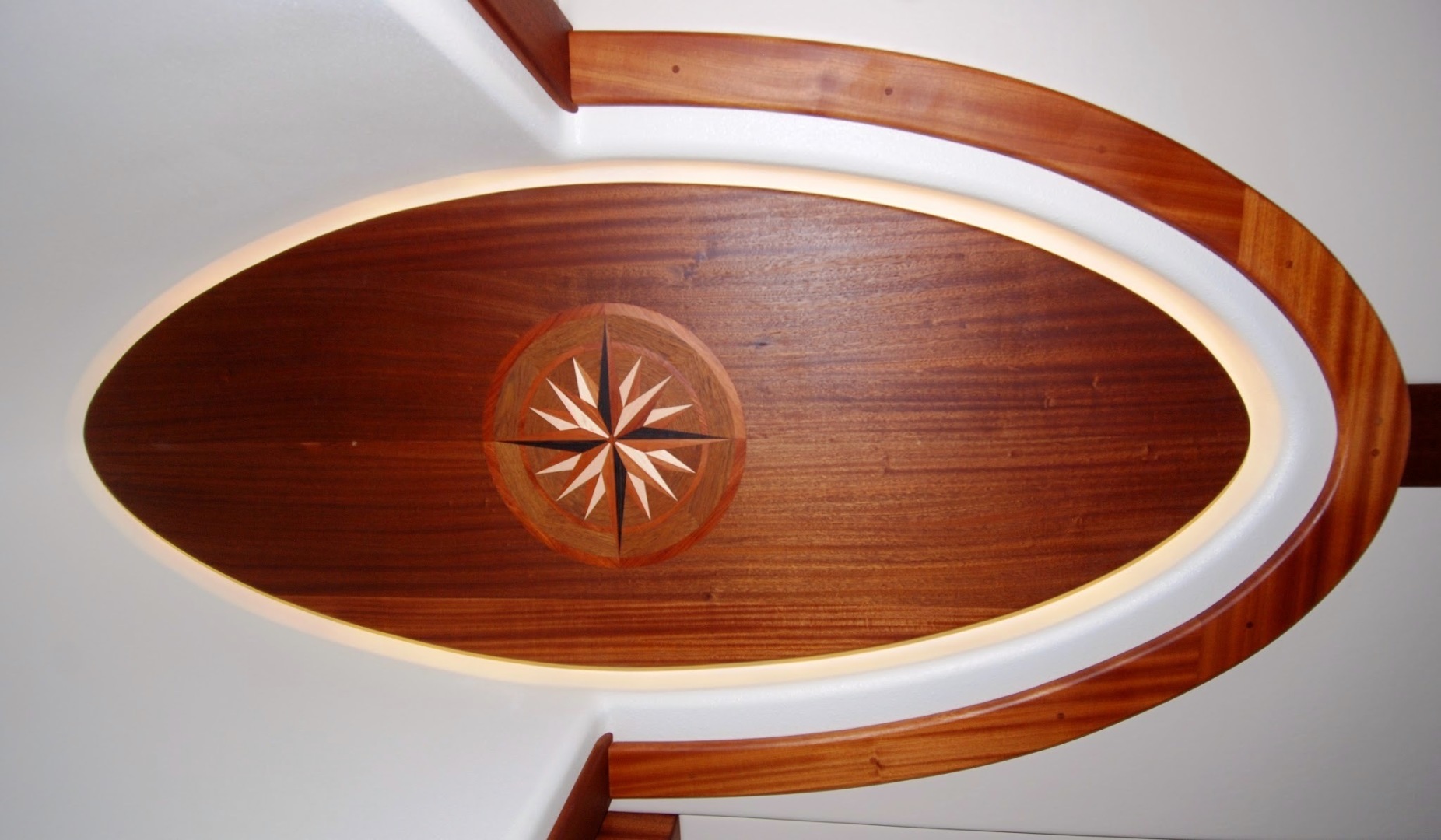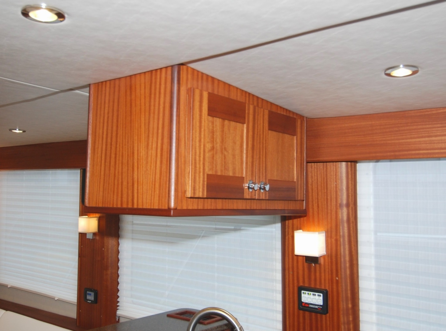 A luxurious and nautical styled interior with rich Sapele grain cabinetry and complimentary Teak